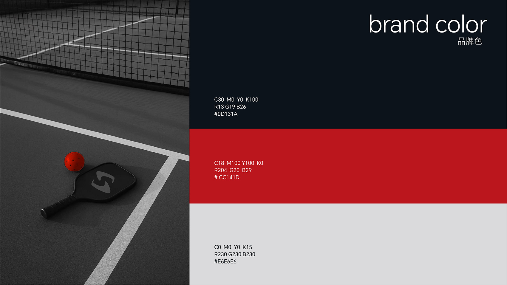 创意思路:VI 设计以红黑为主色调,红色传递匹克运动的激情与竞技属性,强化 “全球领先专业匹克球品牌” 定位;从品牌logo中提炼独特品牌符号,传递速度与能量,品牌覆盖装备全场景,助力玩家识别品牌,沉淀资产、赋能品牌传播。
