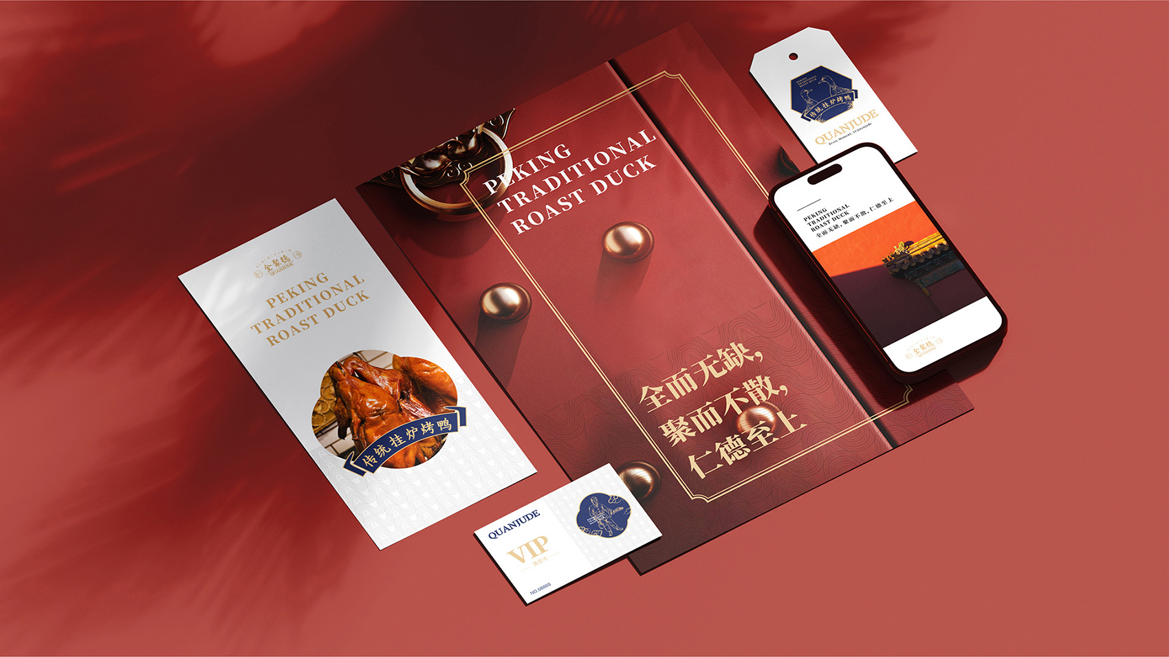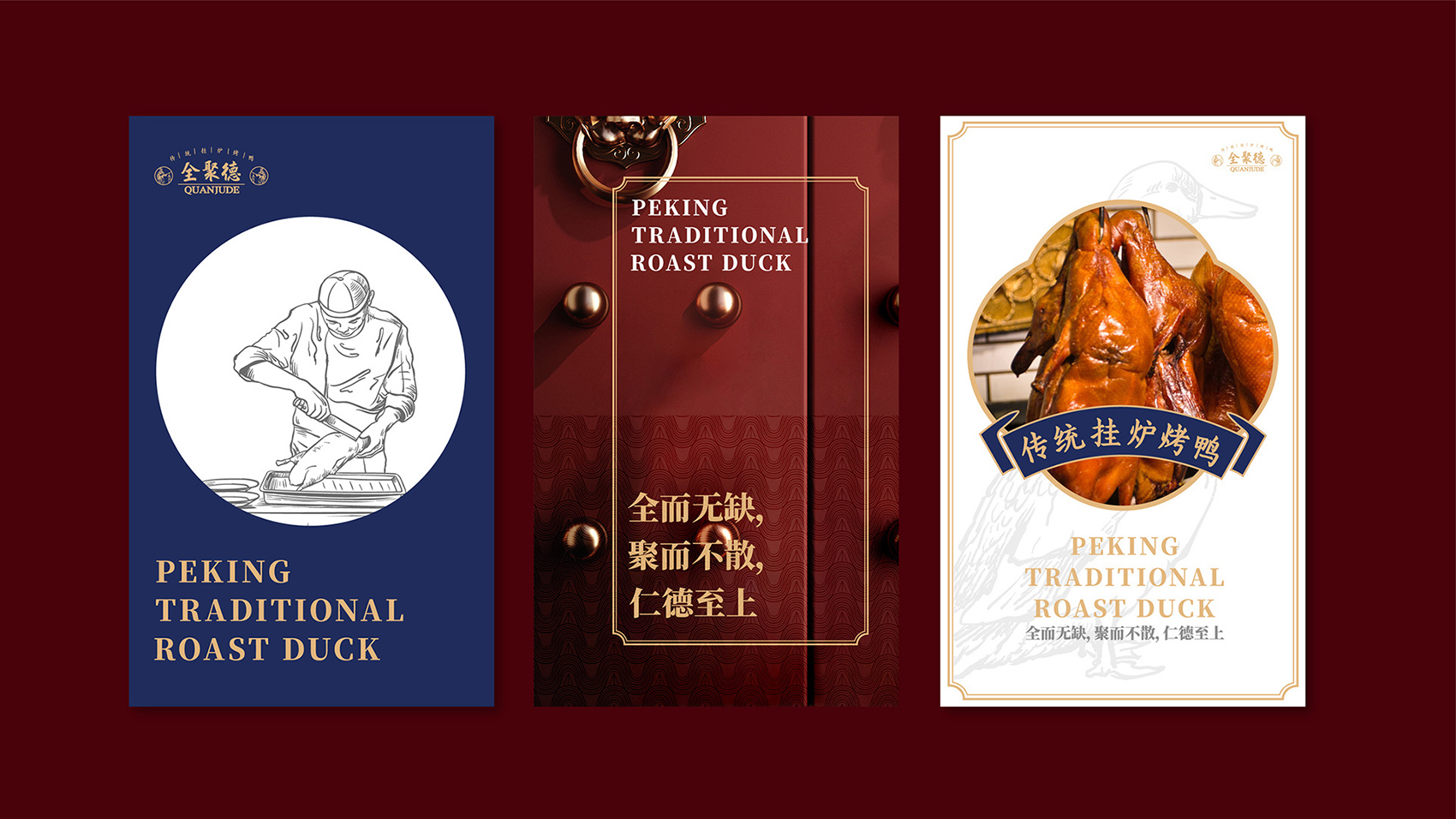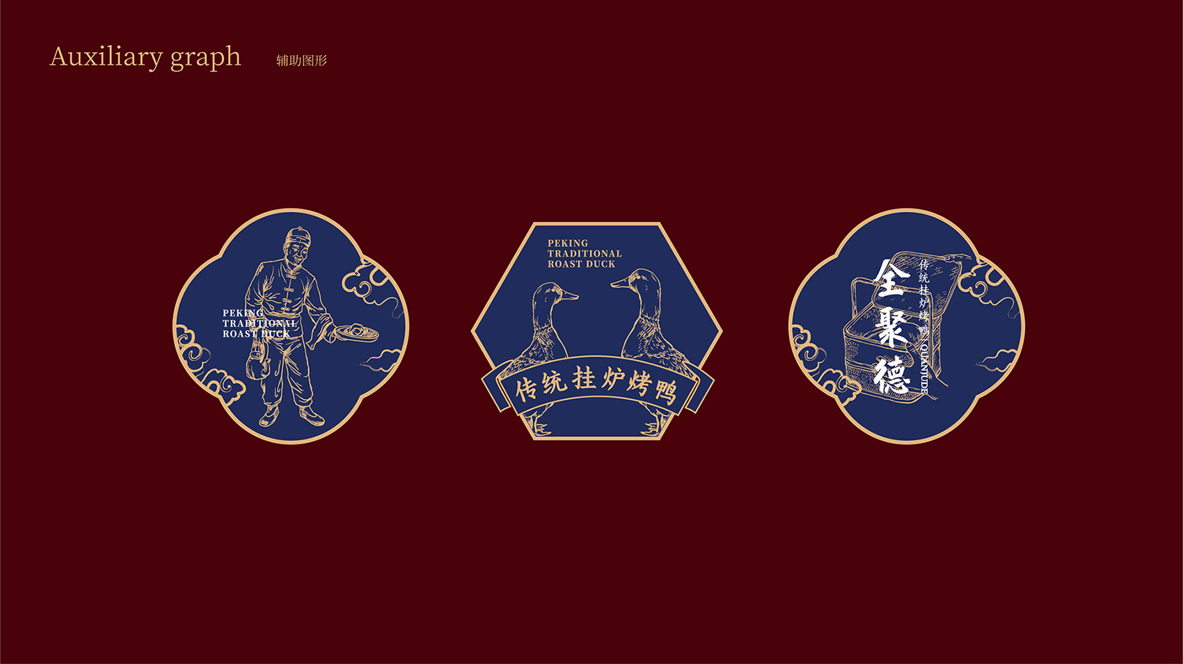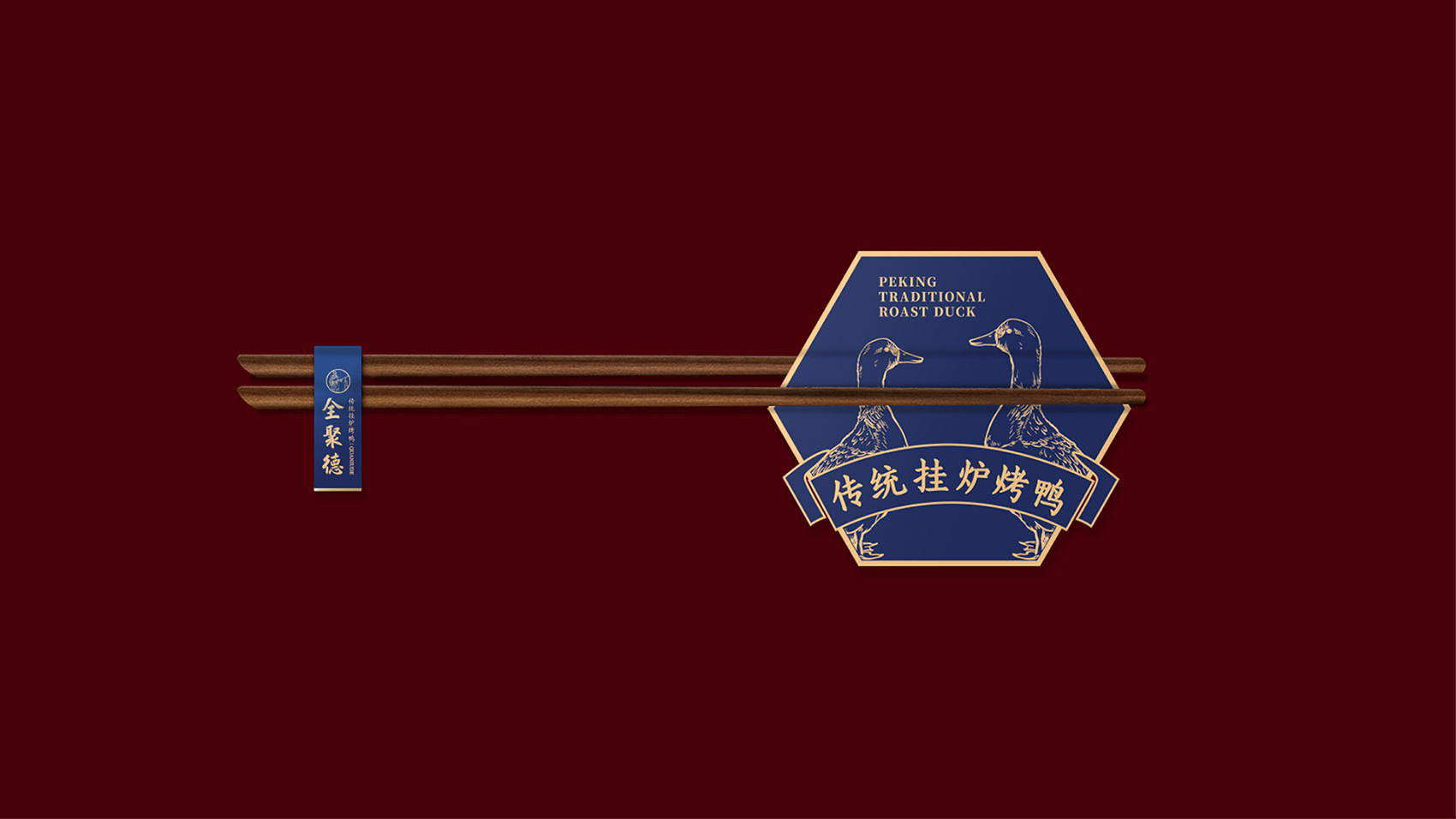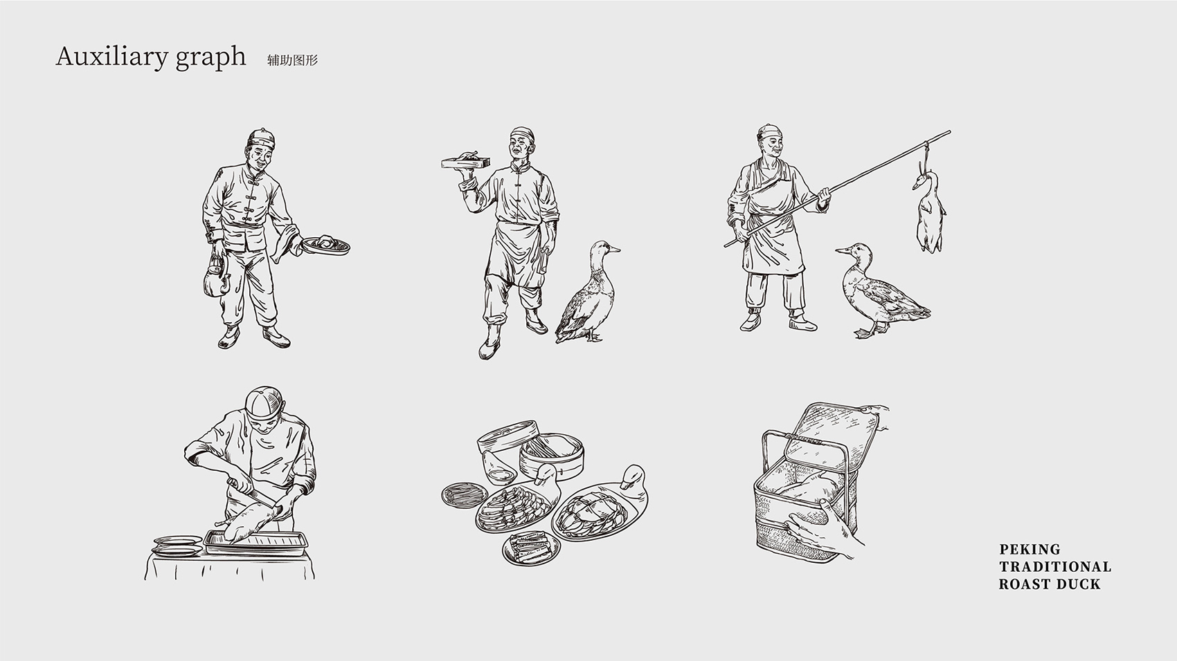 创意思路:品牌整体视觉采用中式复古风格,结合中国六边形、梅花形窗花、牌匾边框,再融合传统楷体与大宋字体,呈现全聚德国字老字号的高端品质与浑厚的文化底蕴。辅助图形通过插画线描的表现方式,展现全聚德烤鸭的制作手艺过程。