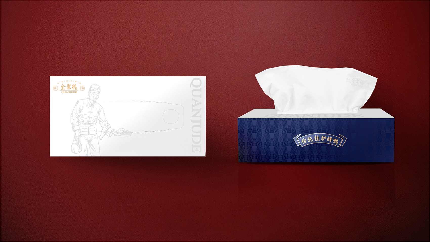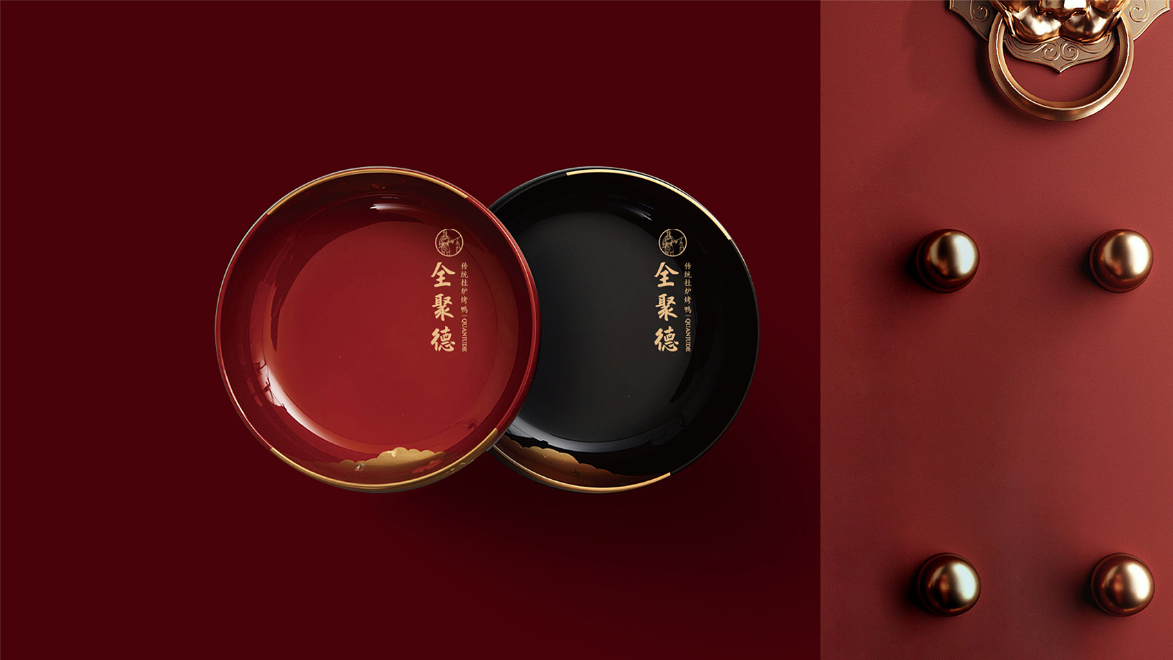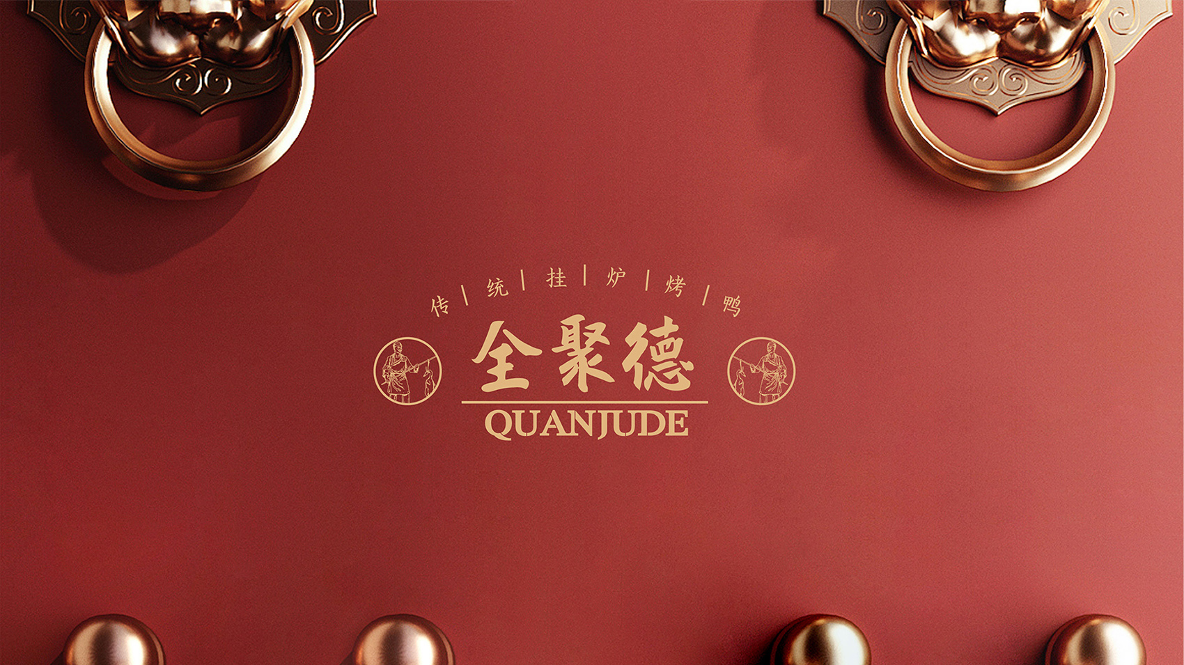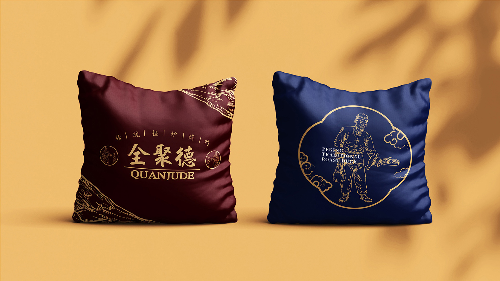 创意思路:品牌整体视觉采用中式复古风格,结合中国六边形、梅花形窗花、牌匾边框,再融合传统楷体与大宋字体,呈现全聚德国字老字号的高端品质与浑厚的文化底蕴。辅助图形通过插画线描的表现方式,展现全聚德烤鸭的制作手艺过程。