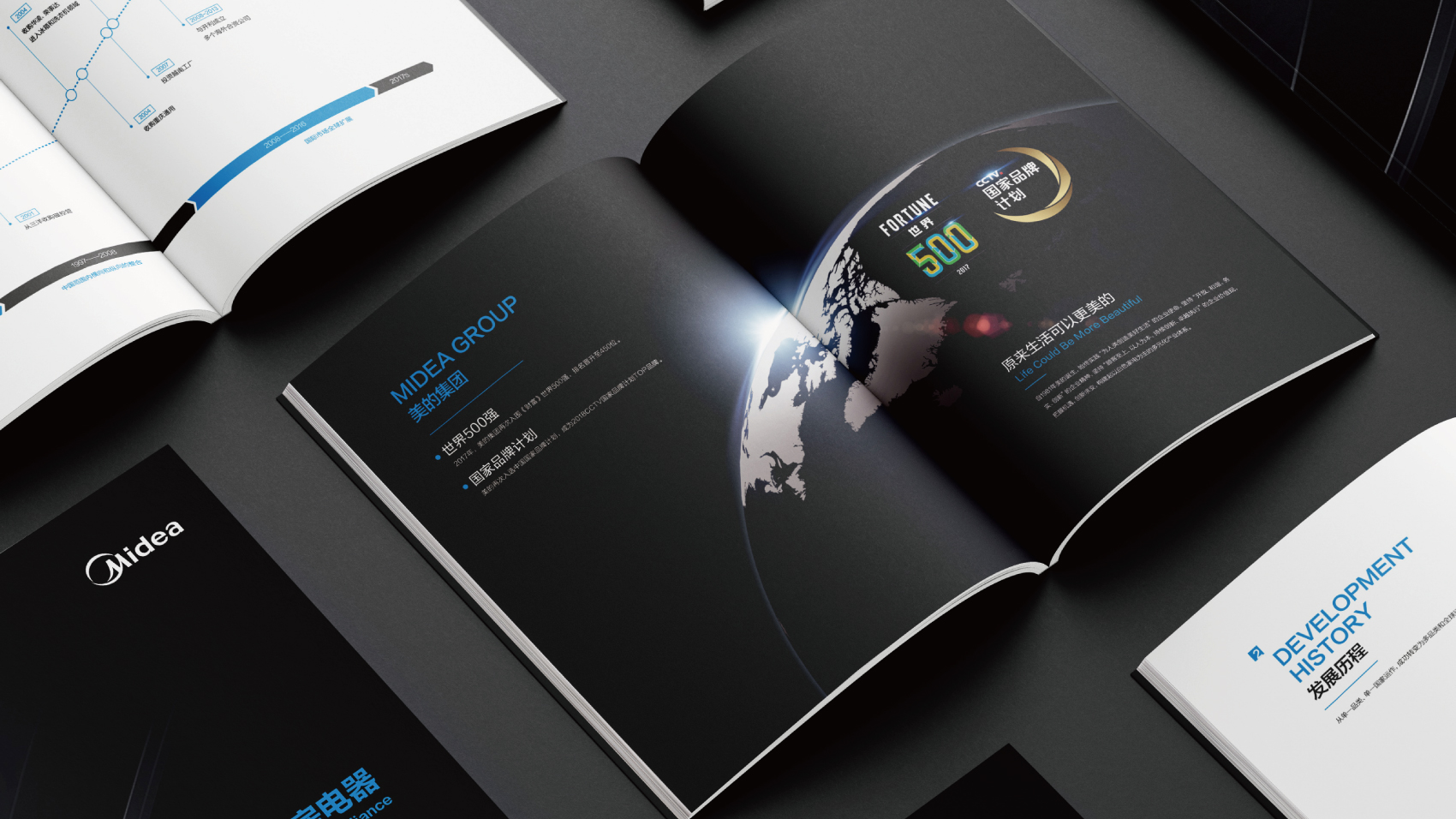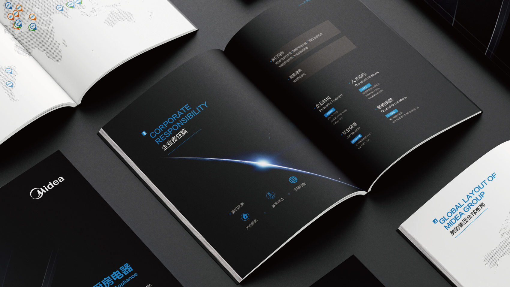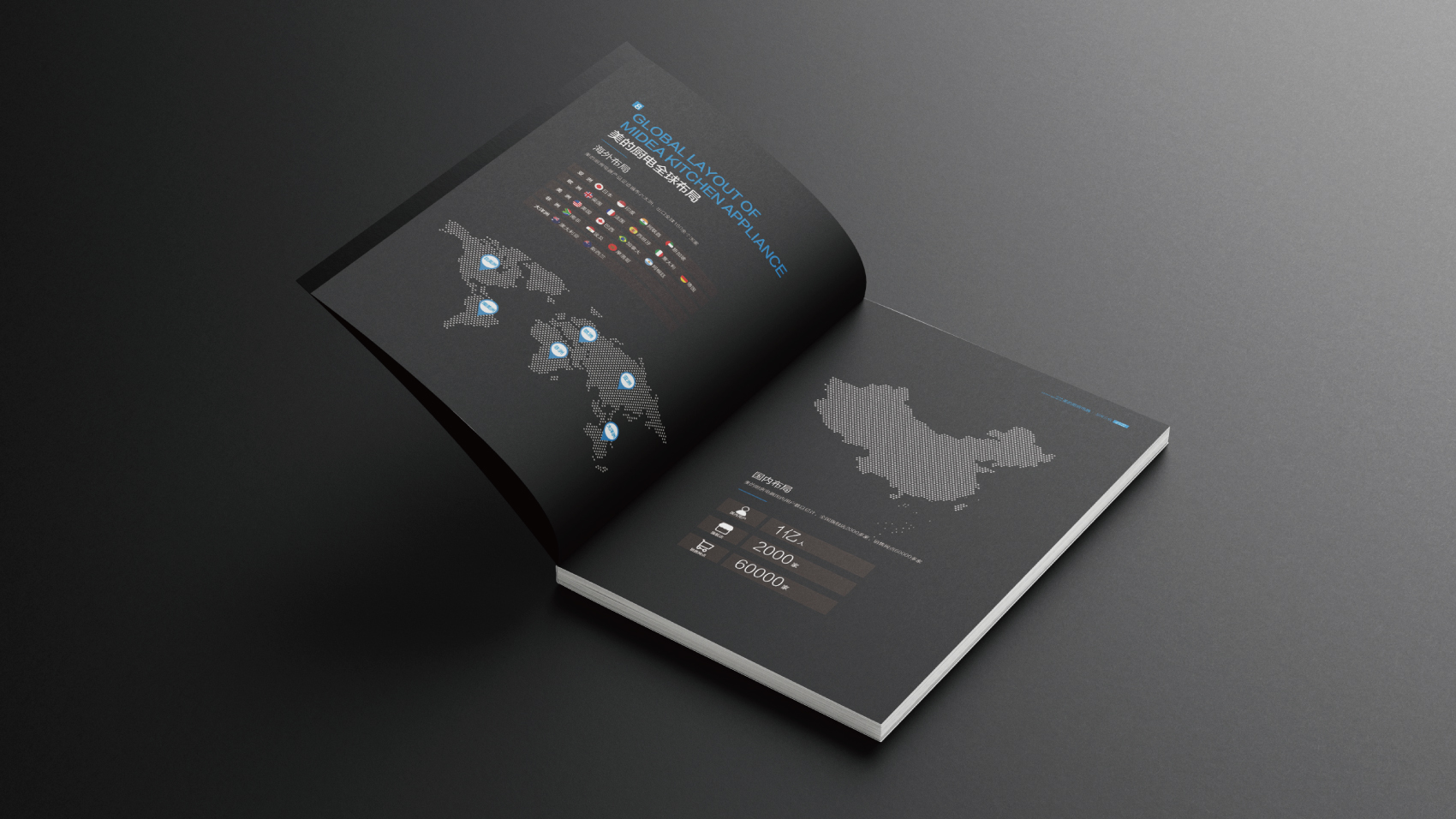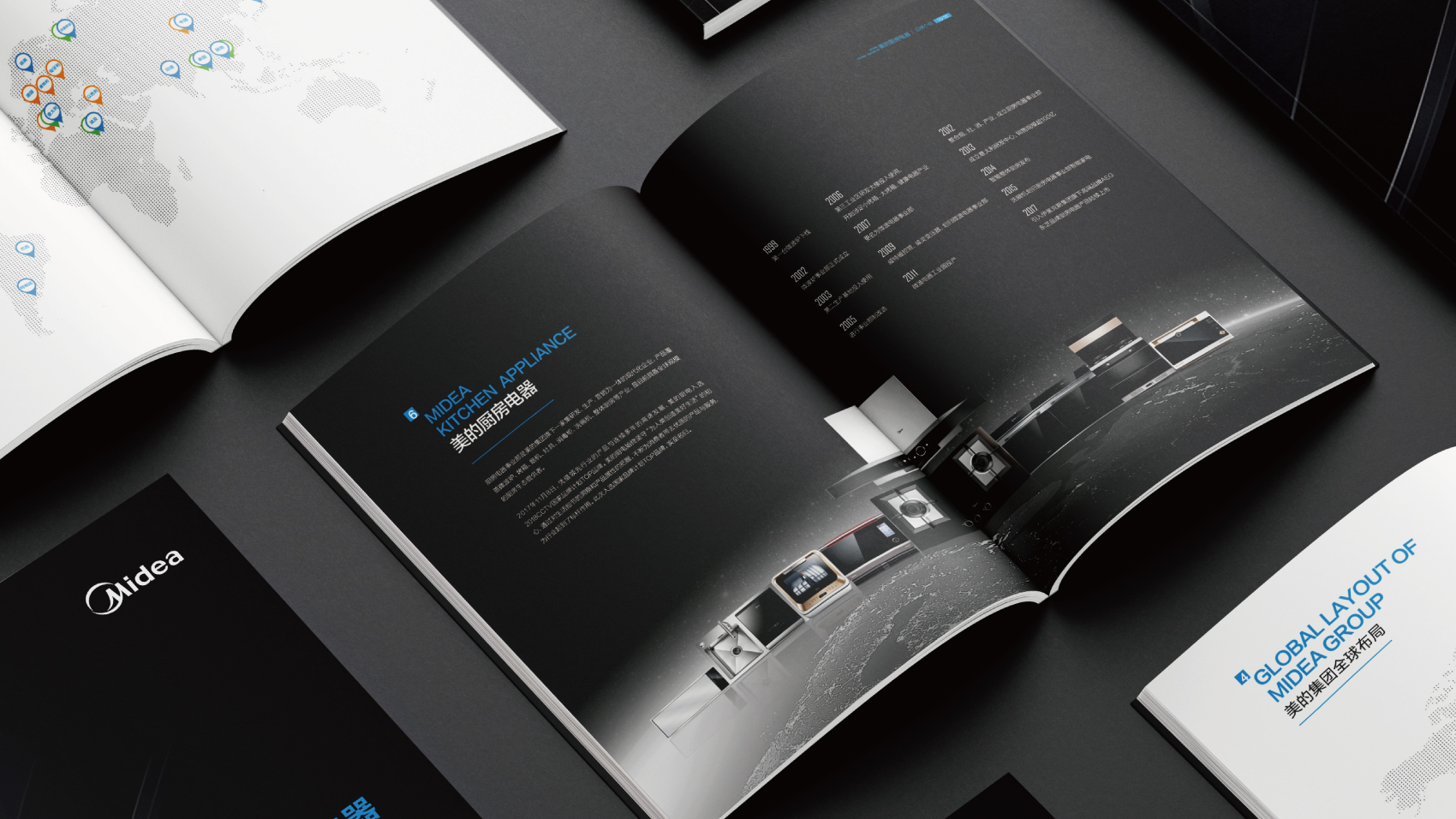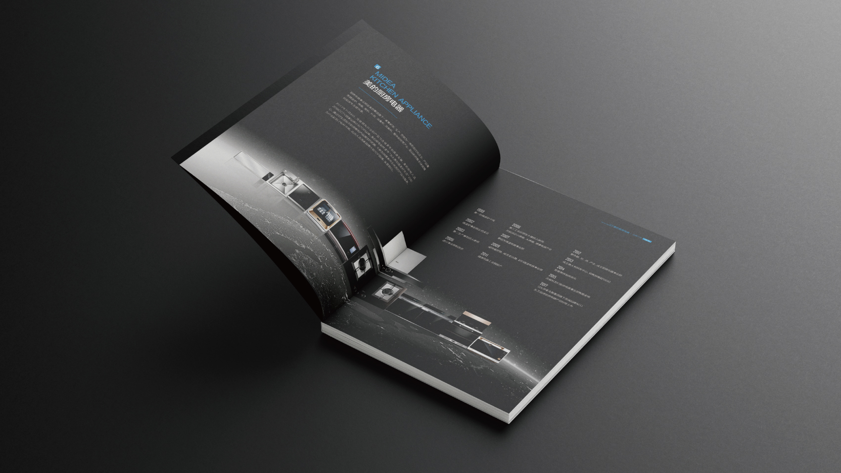 创意思路:美的品牌及产品画册设计,结合美的黑白灰蓝色调要求,画册整体风格呈现简约现代、国际风范,以黑白色为主、美的蓝为辅,画册传递出美的电器所具备的行业属性及高端品质。